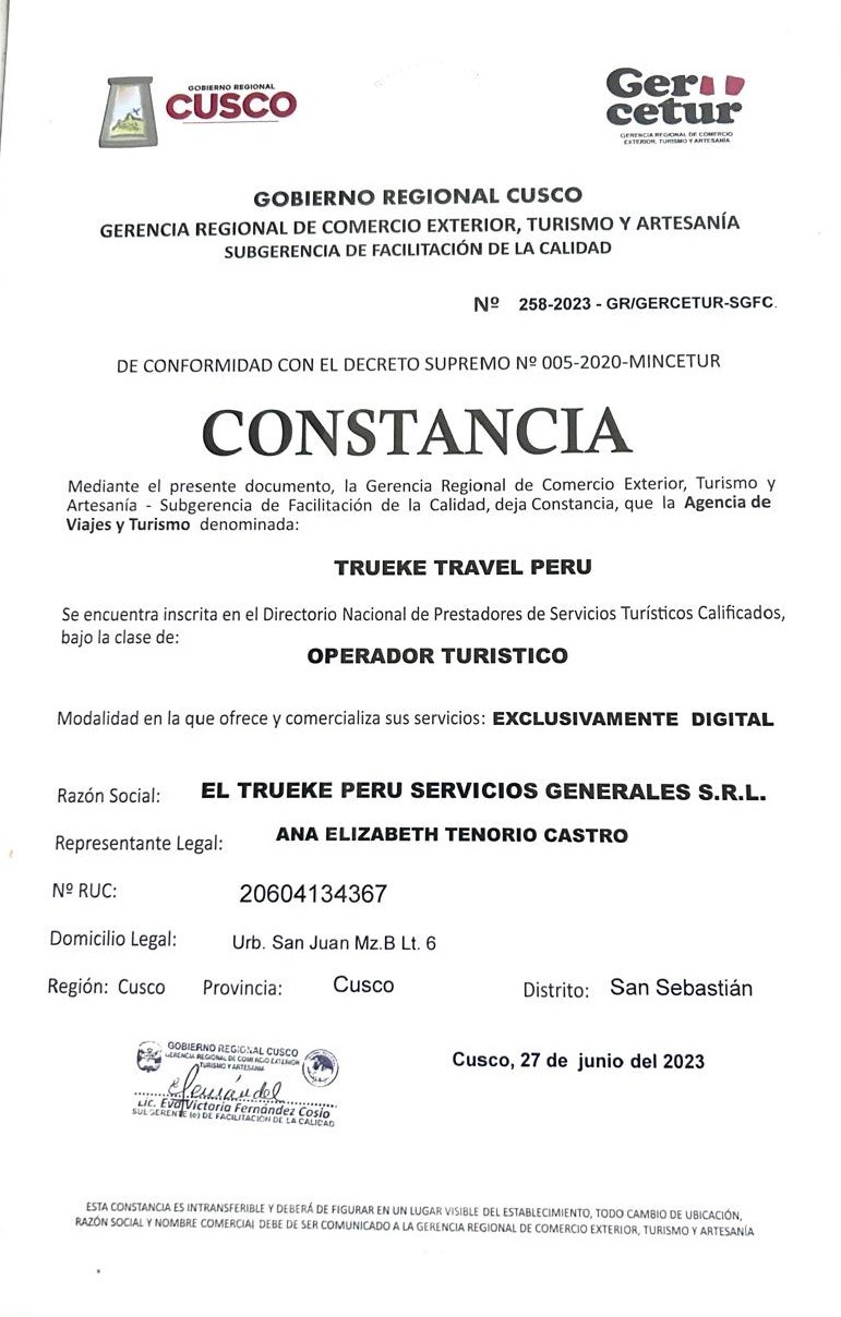 Somos ‘OPERADOR TURÍSTICO DIGITAL’, autorizado por la GERENCIA DE COMERCIO Y TURISMO DE CUSCO GERCETUR, constituida legalmente en la Súper Intendencia Nacional Tributaria con Registro Único del Contribuyente RUC 20604134367.