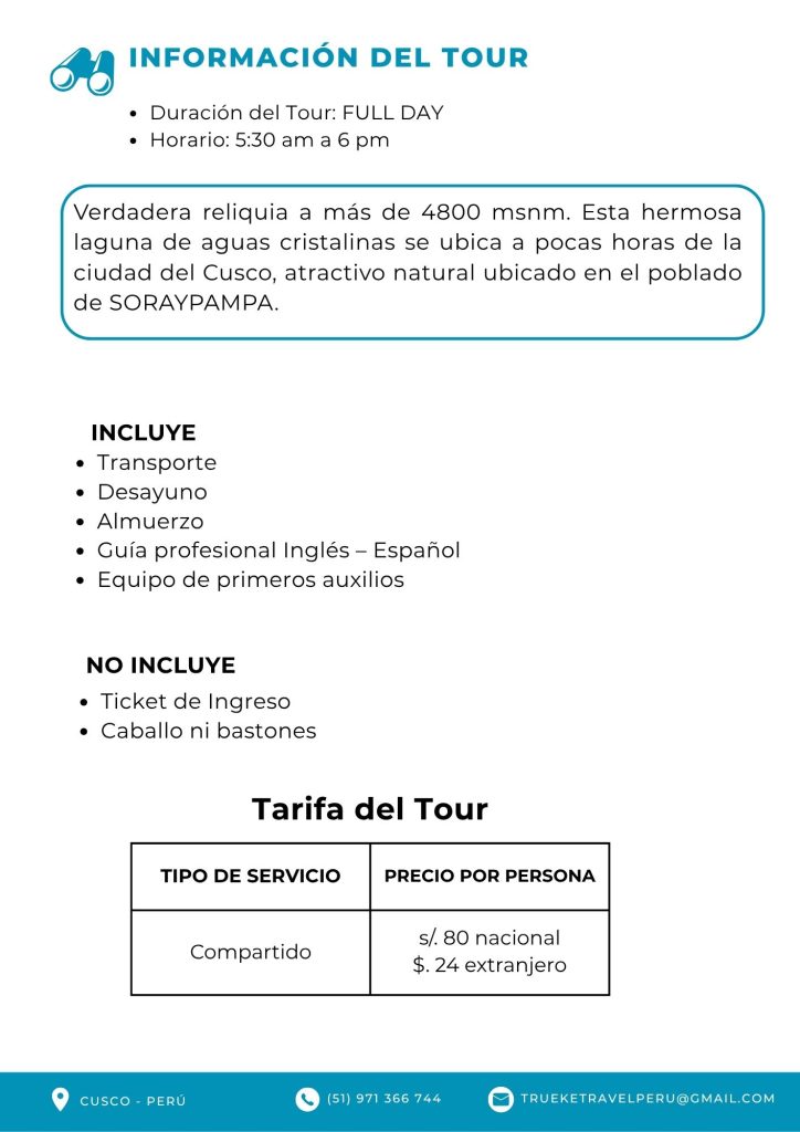 Verdadera reliquia a más de 4800 msnm. Esta hermosa laguna de aguas cristalinas se ubica a pocas horas de la ciudad del Cusco, atractivo natural ubicado en el poblado de SORAYPAMPA.
